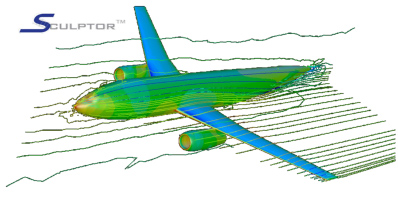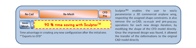 Sculptor™, coupled with a CFD code, allowed finding an improved 3D wing shape in just a few days, while with only CFD it would have taken several weeks. With subtle shape modifications, a sound 8% increase of overall lift/drag ratio was achieved—without affecting the fuselage and turbine nacelle shapes. Sculptor™ avoided time consuming operations on Computer Aided Design (CAD) model and on the computational grid, since its morphing took place over the CFD model directly. Finally, the optimized airplane shape was applied to the original CAD model.