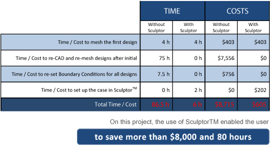 Sculptor enabled evaluation of 124 design variants with an 86 % time savings and an 86% cost savings to the customer when compared to other methods.