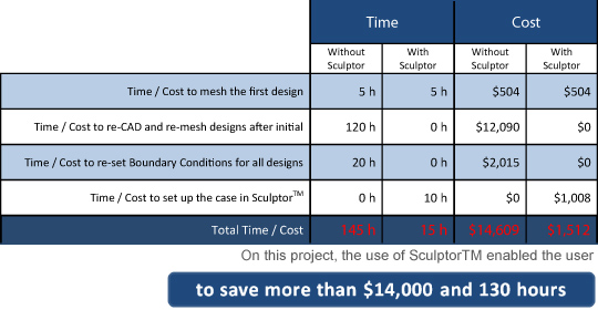 Sculptor enabled evaluation of 124 design variants with an 86 % time savings and an 86% cost savings to the customer when compared to other methods.