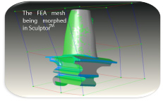 Sculptor™, enabled the customer to fit the two blades with appropriate tolerances, while minimizing the smallest difference. This was done by manipulating Sculptor's ASD volume while minimizing the sum of the differences of each node on the Hot and Cold FEA model. After the two FEA blades were matched, the deformation was applied to the volumetric CFD mesh and in a few moments the customer had a "Cold" CFD model. The entire blade matching process took less than an hour. The deformations were applied to the CAD model using Sculptor's Back2CAD module